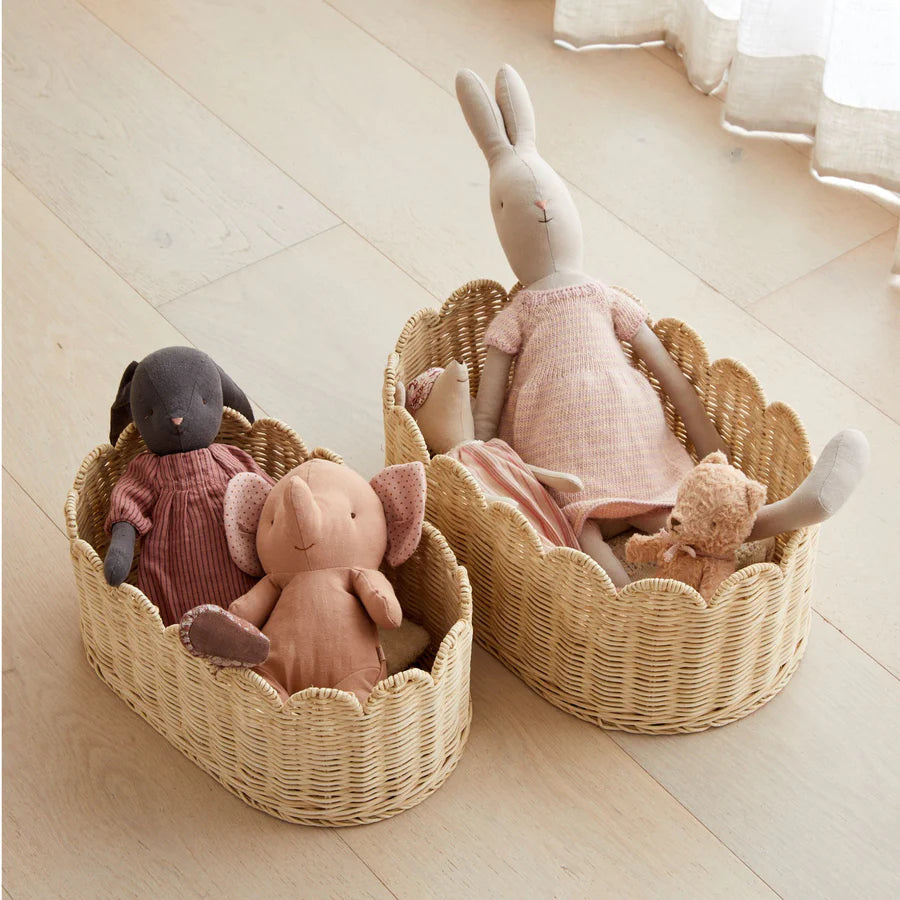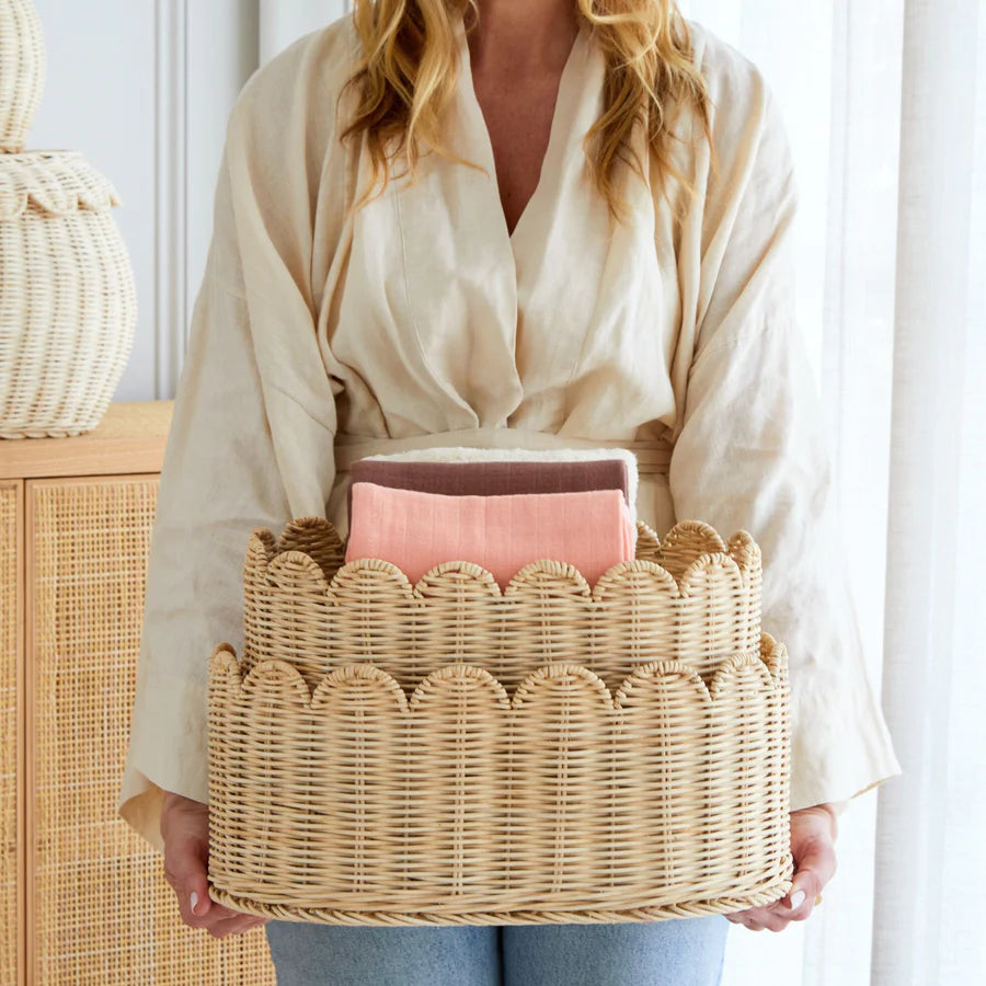 Crafted from natural rattan, these handwoven baskets bring a layer of organic texture and warm, understated elegance to any space. Their oval shape and scalloped edges add a touch of sophistication, making them versatile enough to complement a variety of interior styles and color schemes.