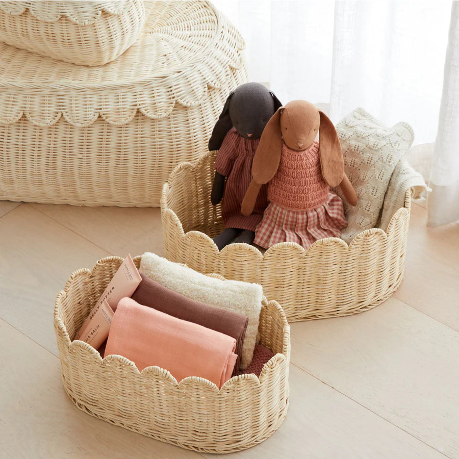 Crafted from natural rattan, these handwoven baskets bring a layer of organic texture and warm, understated elegance to any space. Their oval shape and scalloped edges add a touch of sophistication, making them versatile enough to complement a variety of interior styles and color schemes.